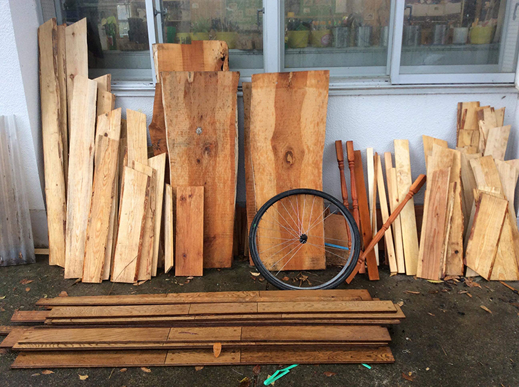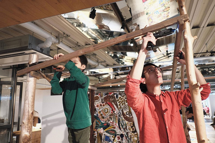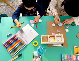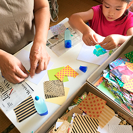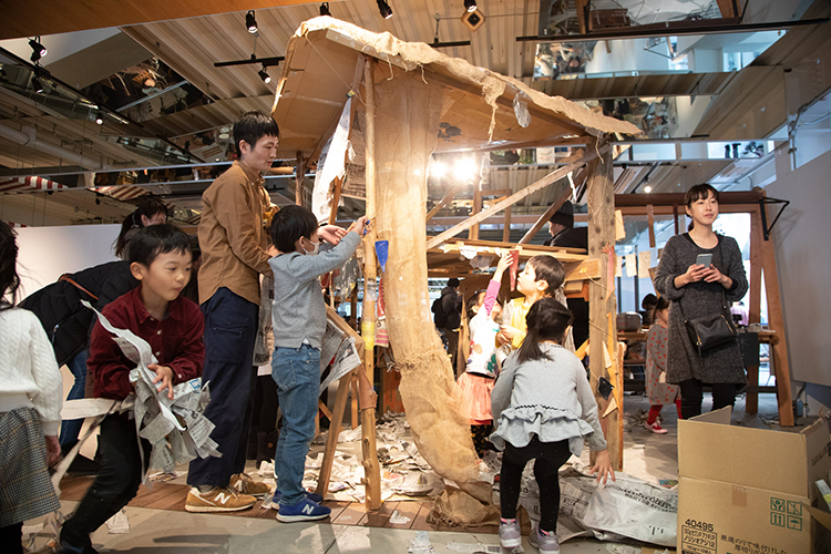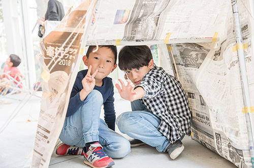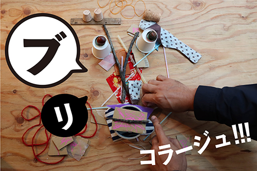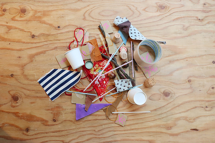 ダンボール、新聞紙、トイレットペーパーの芯、壊れた機械・・・。VILLAGE や会場の TMMT、そして地域に由来するいろんな素材が集まります。色、形、大きさ、観察をしているうちに、きっと何かつくりたくなるはず。