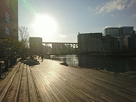 水、地、火、空、風をテーマに運河に面したウッドデッキ遊歩道にて朝の sunrise キャナルヨガを開催。キラキラと輝く運河の『水』面は、心癒え静けさを取り戻す。ポカポカとした朝の日差しを浴び『地』に足をつけたヨガポーズは、メラメラと燃え続ける『火』のように体内に熱を生み出す。