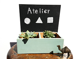 トンカチを使った木工ワークショップです。4色のボックスからお好きな色を選んでもらい、黒板とボックスを釘で打ち付けます。トンカチの持ち方、釘の打ち方をしっかりとお伝えします。最後はボックスにお絵かきして出来上がりです。こどもから大人まで楽しめるワークショップです。植物ひとつプレゼント。