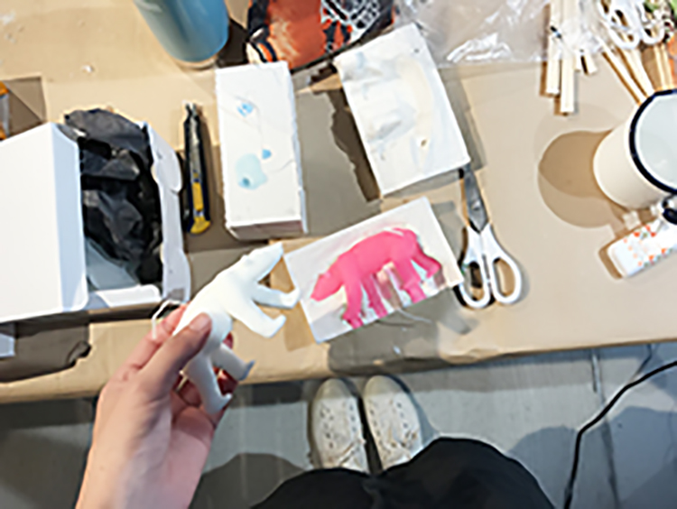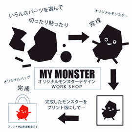 黒と白のいろんな形のパーツを組み合わせて自分だけのオリジナルモンスターをデザインします。完成したモンスターはその場でシルクスクリーンプリントに。