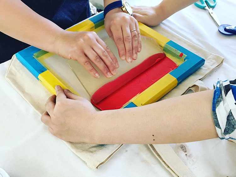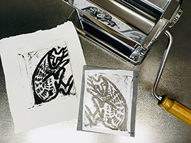 フランスのアーティストが考案した「キッチンリトグラフ」。専門的な道具を使わずに、台所にあるような材料だけで誰でも手軽にリトグラフ版画を楽しめる方法です。パスタマシンがプレス機代わりです。
