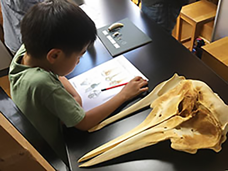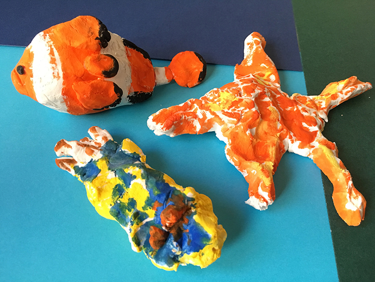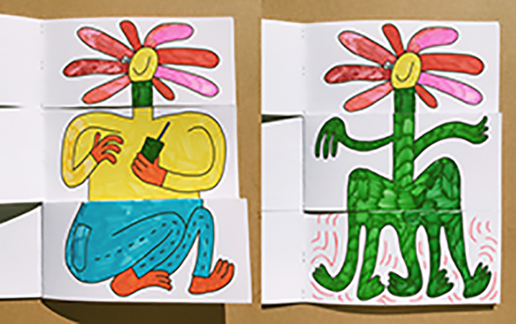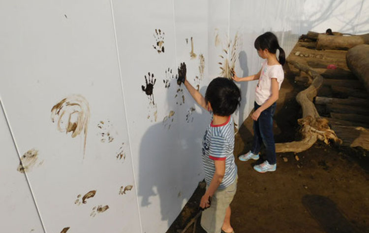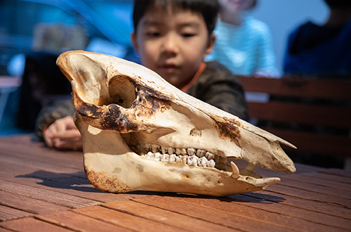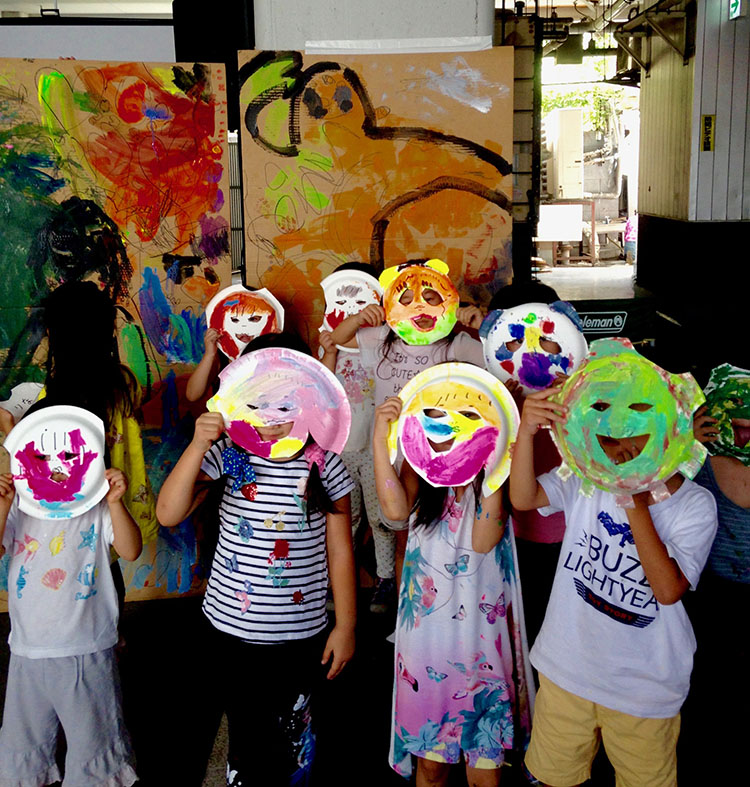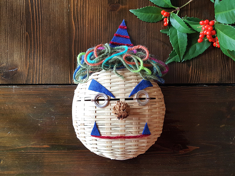 1枚の紙から絵の具やクレヨンなどで模様をつけて、自分だけのお面つくり。見たことのない生き物の顔を想像しながら、自由につくってみよう。完成したらお面をつけて、不思議な生きものに変身です。