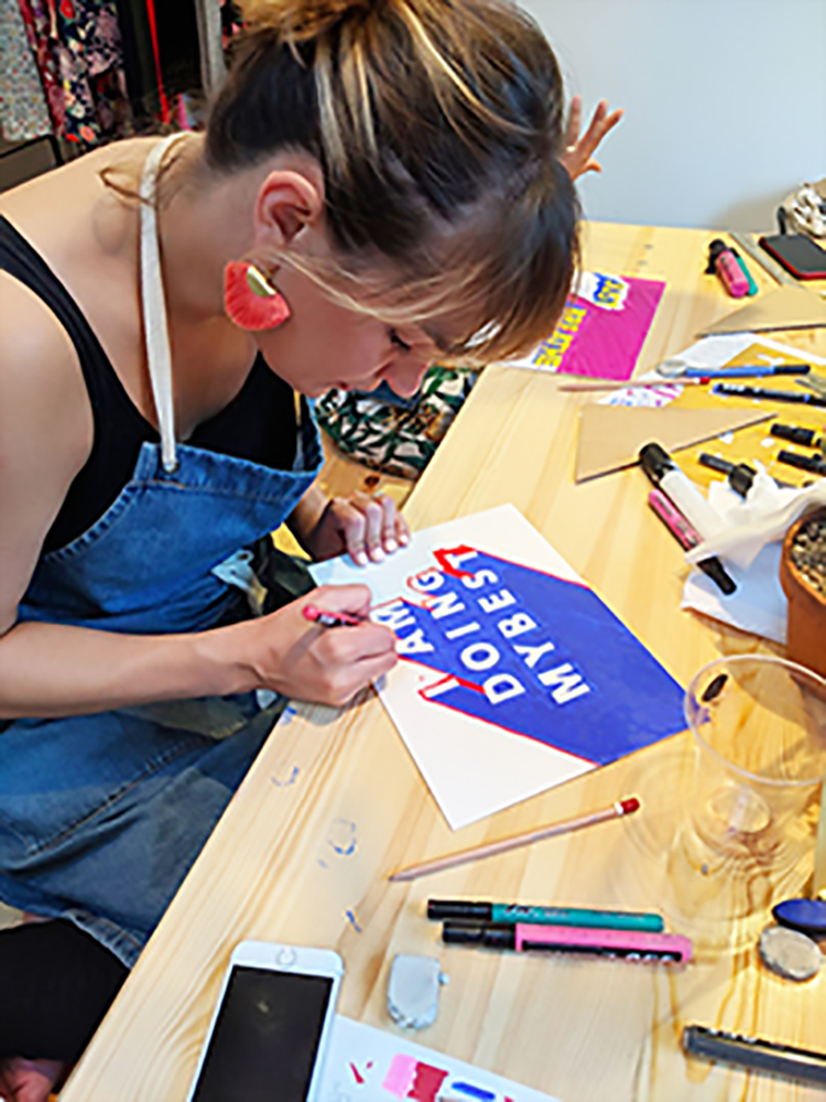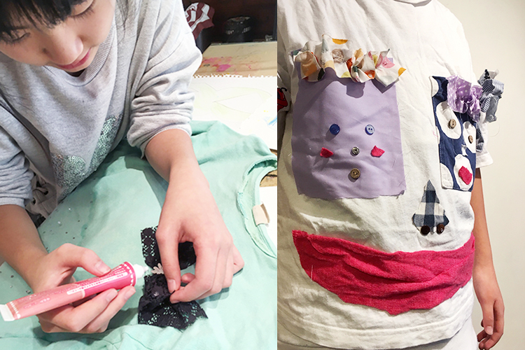古着の山の中から選んだ服にペイントしたり、布やリボン、レースをコラージュ。ずっとお気に入りでいられる、自分だけの1着に変身させましょう。どうやったら服を長く着られるか、みんなで意見交換してみましょう。