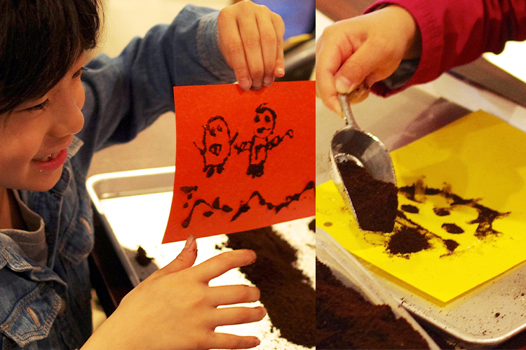コーヒーを淹れたあとに残る湿った豆のカス。お日様に当てるとサラサラになって・・お絵かきの材料として生まれ変わりました。糊で描いた透明な絵が、コーヒーの粉をまとって浮かび上がります!コーヒーは、フードで参加している北品川のカフェ『KAIDO books & coffee』さんのコーヒー豆を使用。