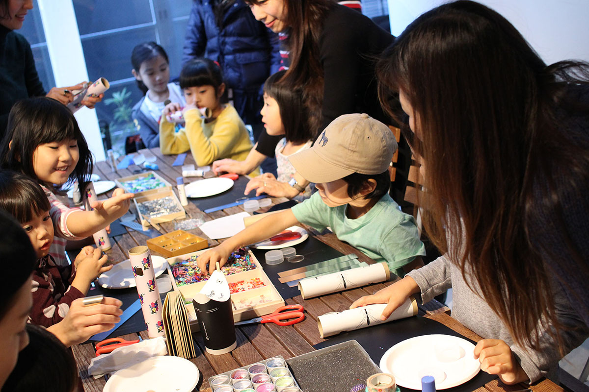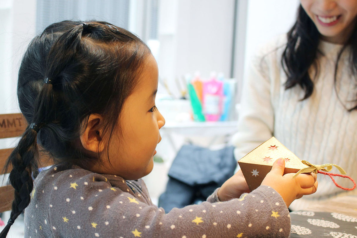 この季節のインテリアにぴったりの、ツリーをモチーフにしたギフトボックス作り。紙や模様を選んで、自分だけのデザインを完成させます。2つ作ってママにプレゼントしている子も。