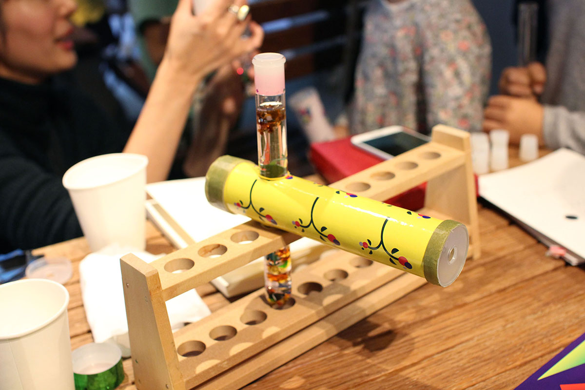 これを入れたらどんな風に映るんだろう、と考えながら鉱物、ガラス、ネジやクリップなど、好きな物を試験管に詰め込んで作るオイル式万華鏡。くるくると景色が変わる、自分だけの世界が完成です。