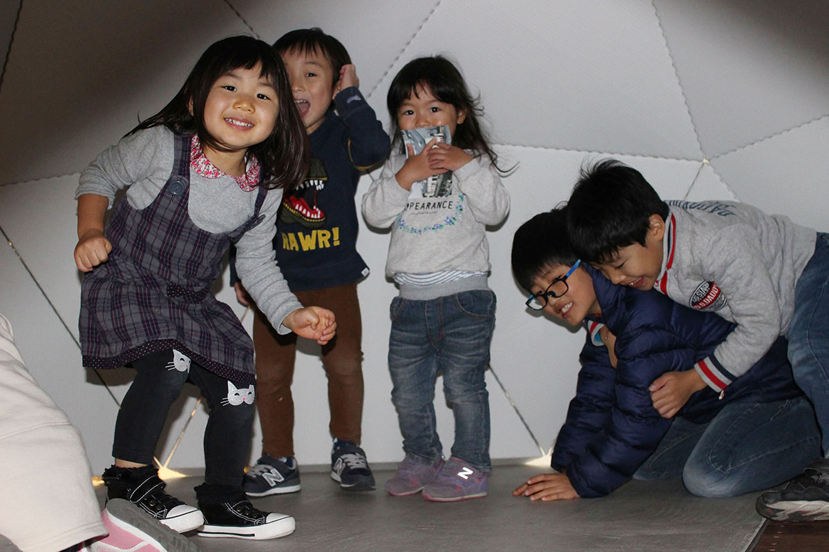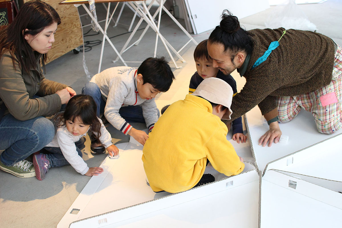 みんなで構造を考えながらダンボールを組み立てて、会場に巨大なドームが完成。完成したドームはおうちや秘密基地など、様々な遊び場に変化していきます。想像次第で遊び方は無限大です。