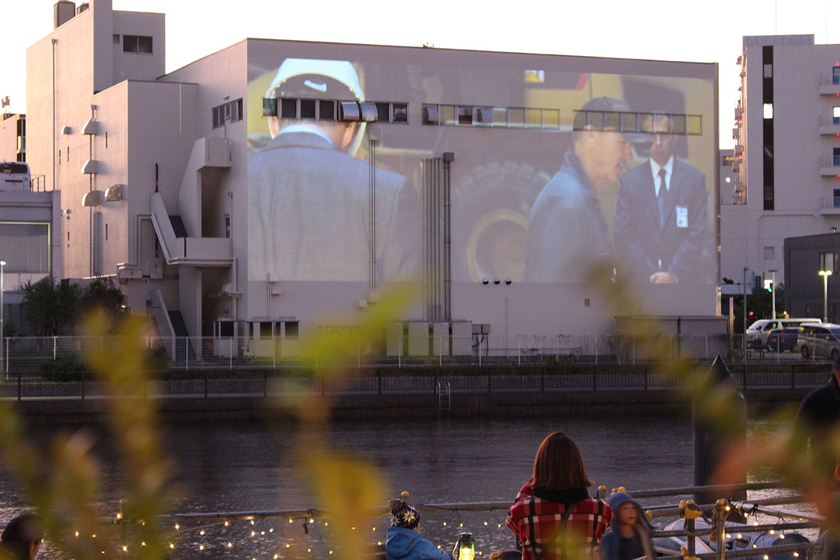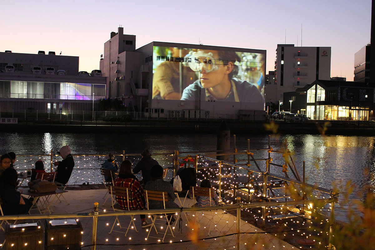 天王洲運河沿いのビルに映る巨大スクリーンで、大迫力の映画鑑賞。