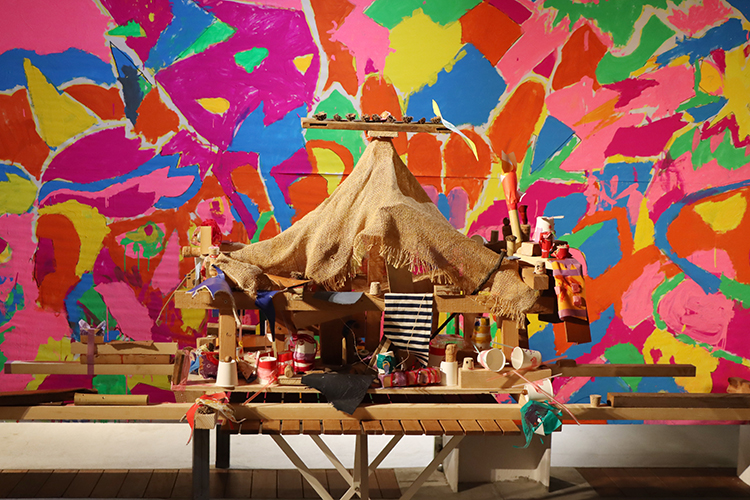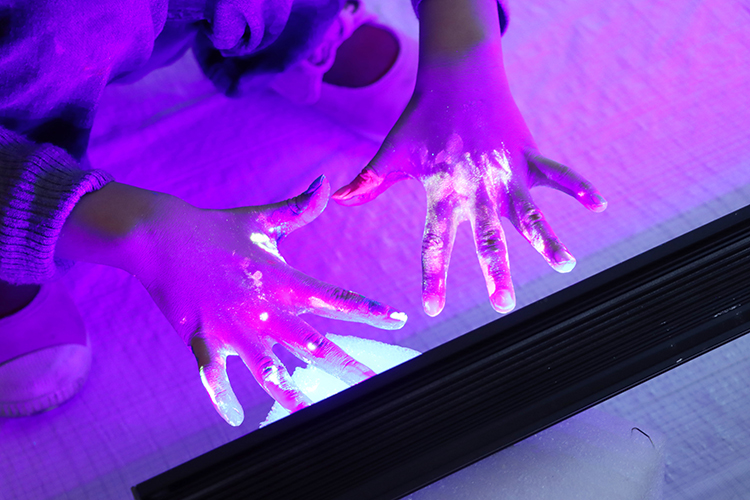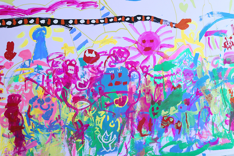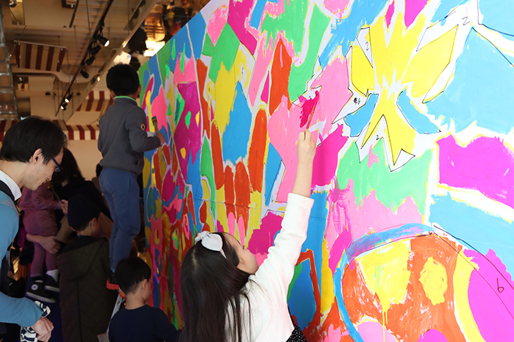 光をあてるとピカピカひかる不思議な絵の具を使って、大きな壁に色を塗っていきます。小さい子も脚立に乗って手を伸ばしながら。からだをめいいっぱい使って描いていくと、みるみるうちにたくさんの鬼が登場!