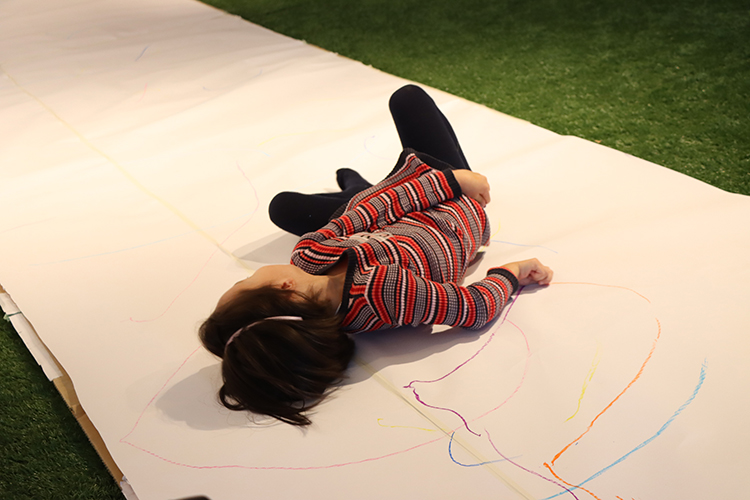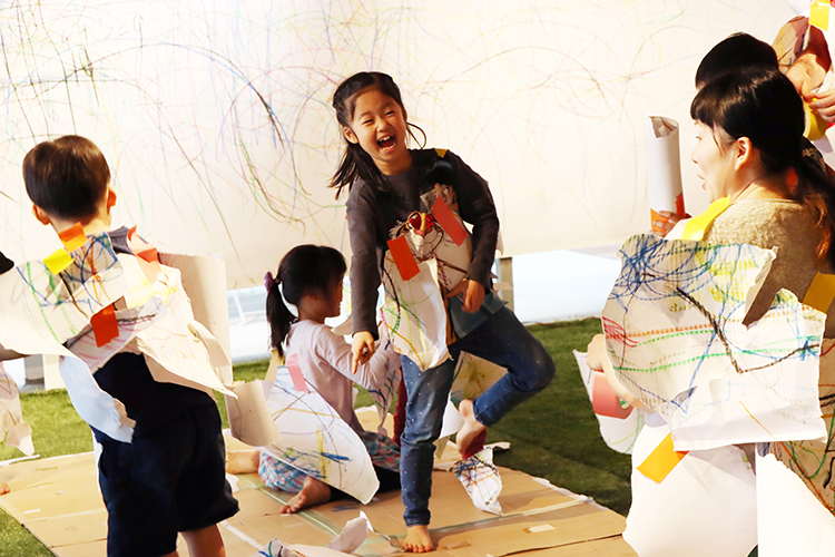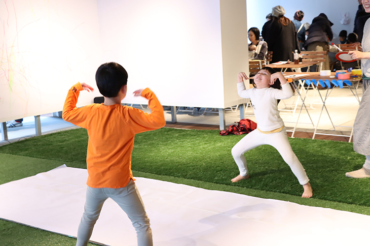 友達と向かい合わせになって自由にポーズをとったり、友達のまねっこをしたり。芝生でゴロゴロ絵を描いて、ビリビリちぎって自分やみんなにペタペタ。前回に引き続きの「からだで遊ぶ」ワークショップ、今回も寒さに負けず元気モリモリでした。