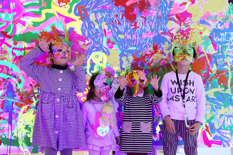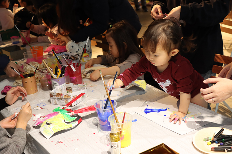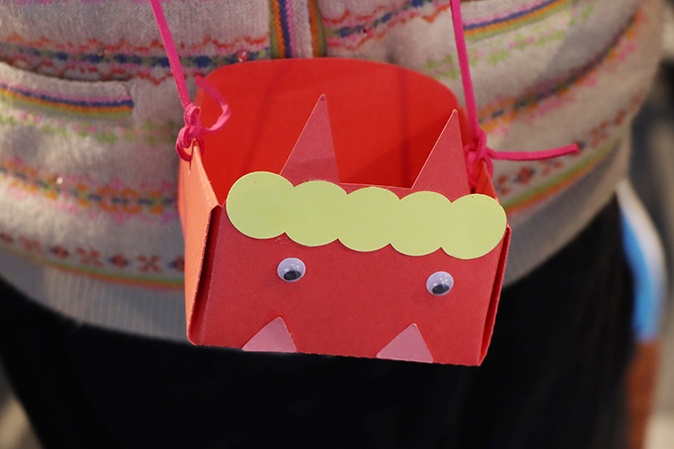 絵の具やクレヨンで自由に絵を描いて、キラキラのビーズや貝がらを貼り付けて。じっくり心ゆくまでつくったら先生に教えてもらいながら組み立て作業。自分で描いた絵がみるみるうちに「生きものの顔」に変身していく様子に、みんなワクワクしていました。完成したらお面をつけて、お隣のペイントワークショップの作品前で写真撮影。ちょっと不気味な色のライトに照らされて、まるで本物のモンスターみたい!
