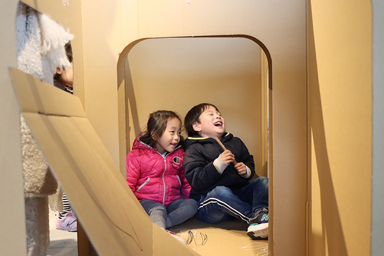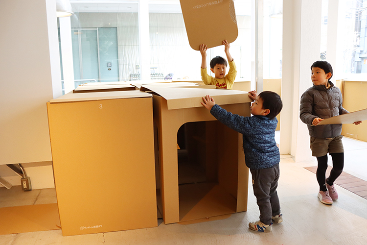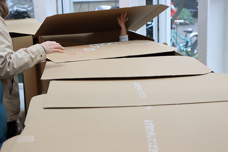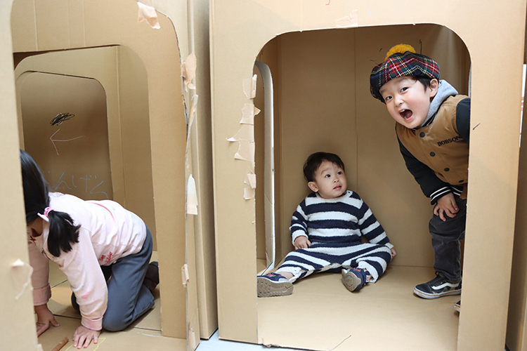 みんなで相談しながら組み立てて、道や出口がいっぱいの、迷路みたいなトンネルが完成。トンネルの中に矢印を描いたり、かくれ『ニコちゃんマーク』を描いて遊べる仕掛けをつくったり。人が増えるたびに少しずつ変わって、どんどんおもしろくなっていきました。