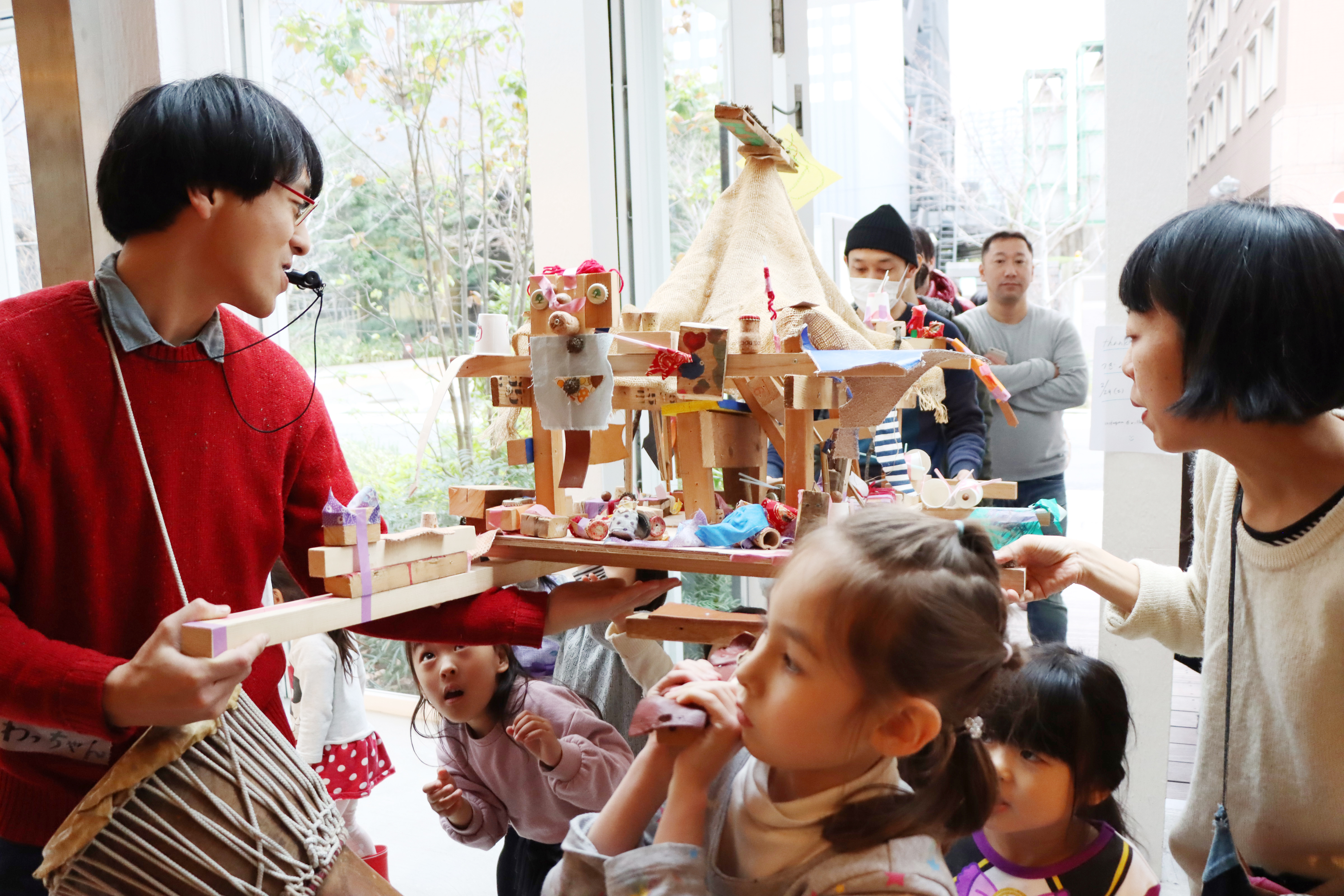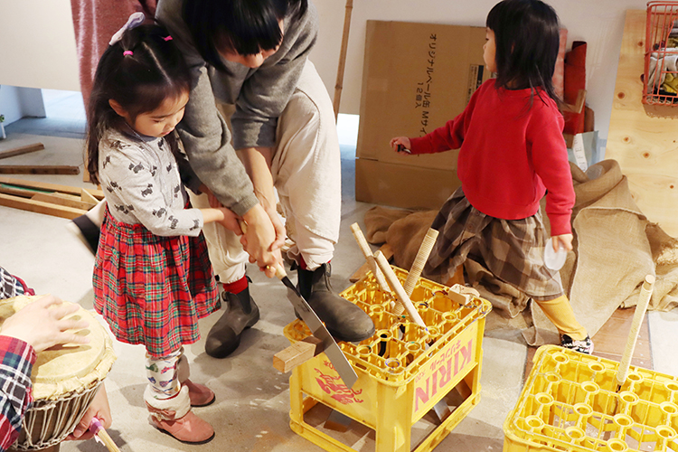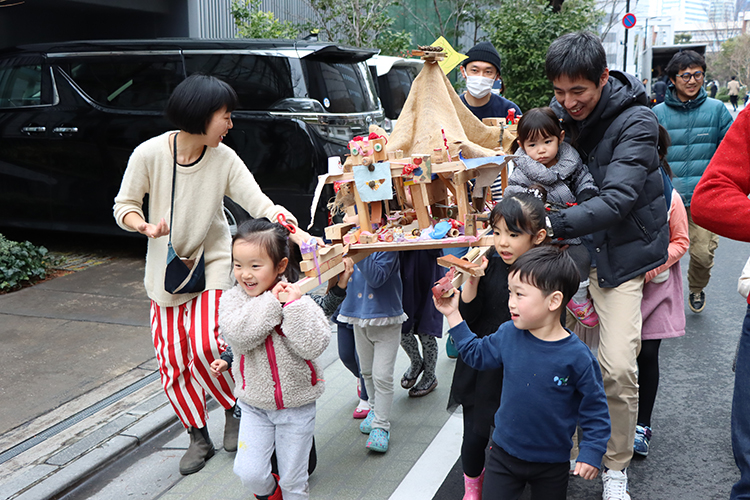 大工さんが使う本物の道具を使っておみこし作り。最初はおそるおそる、慣れてくるとノリノリで、ノコギリで切ってクギでくっつけて。おみこしに載せる神様、パレードの楽器まで全部みんなで作ります。完成したら、子どもも大人も元気に「わっしょい!!!」