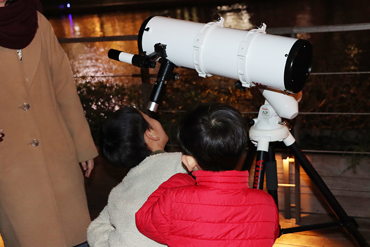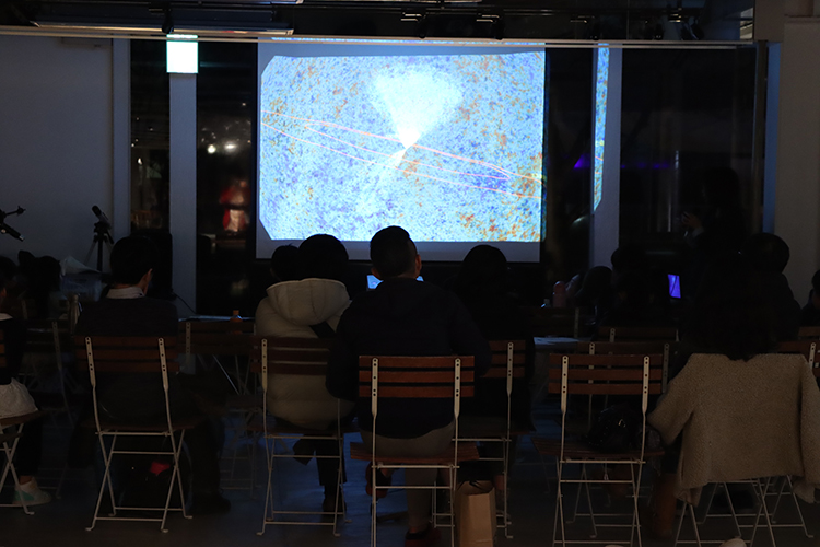 『天文学』の専門家による宇宙の授業。冬にみることのできる季節の星座について学んだ後は、大きなスクリーンを使ってみんなで宇宙旅行!少しくもっていたので星を見ることはできませんでしたが、望遠鏡で空をのぞく体験はとてもワクワクしました。