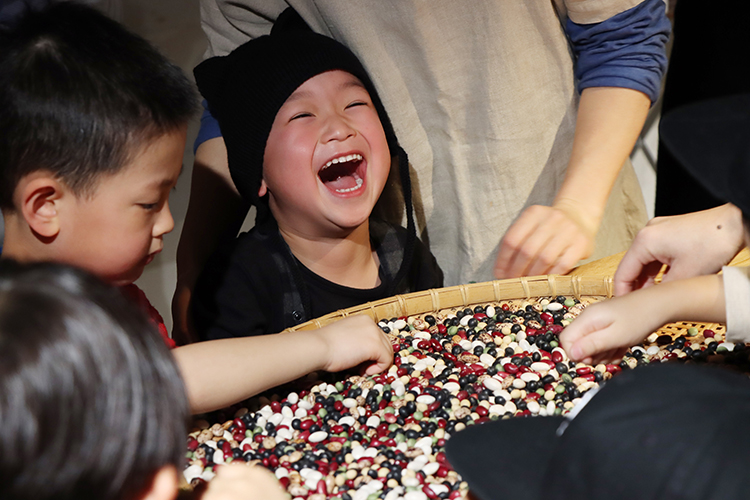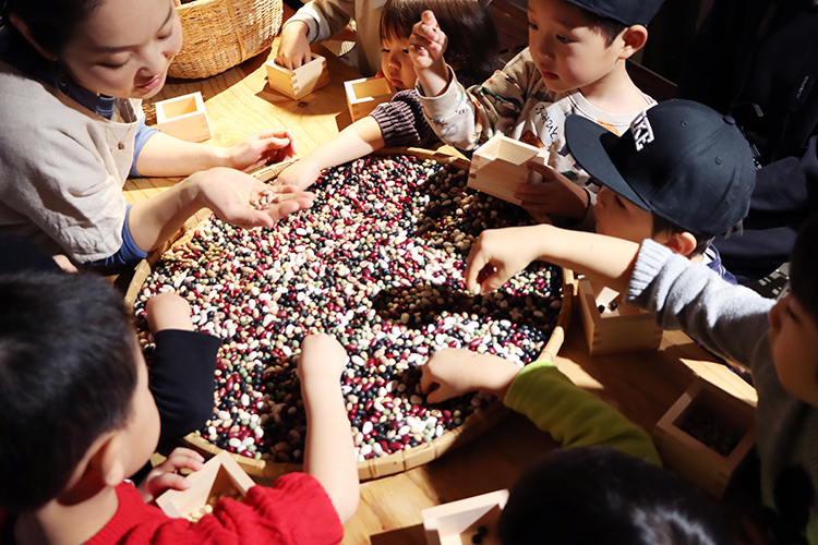 豆に触れながら、じっくりみながら『豆』や『福』のことをみんなでおしゃべりします。自分の福なモノ、コトってなんだろう?この豆って、何に似てるかな?みんなのいろんな意見が混ざって、『福』な時間に。